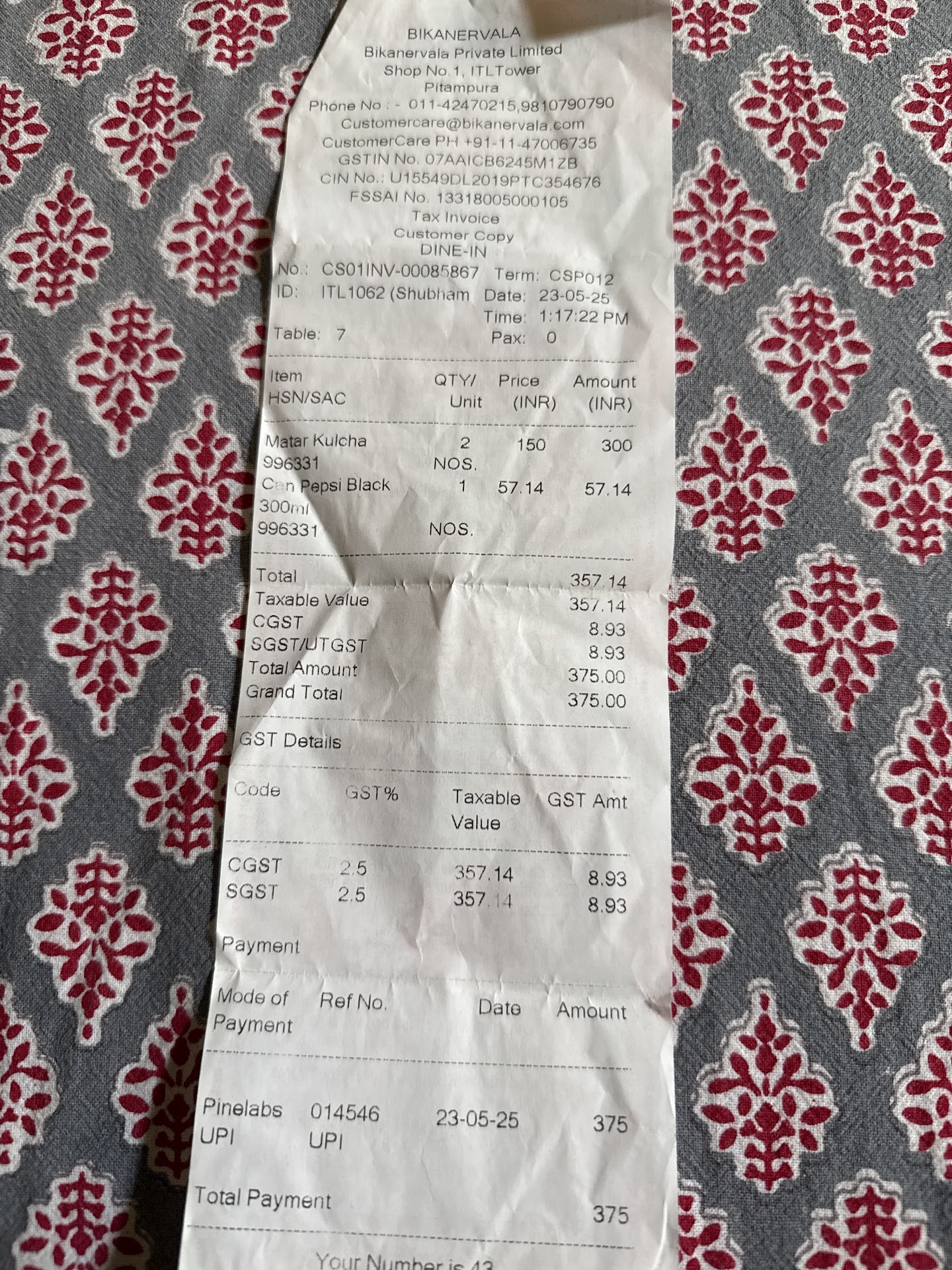 Ā Ā Ā Read moreSo, I have visited the outlet earlier too , the fact that they are more attentive and service standards have improved ...shows that some effort is being put . Unfortunately ,yesterday a big plastic sharp edge of a container was found in my mutter kulcha Luckily ,I was chewing on hard and something sharp pierced my gum . I immediately took the piece and went to the floor manager Dhruv who was courteous and apologetical . I went to show him the piece to get it inspected , NOW what pissed me off was that he had the piece thrown as soon as I showed it to him like he was trying to hide it from me committing any commotion which I wasn't going to and I told him that I gave it to you to verify . I asked for the piece back and he said "thatās in the bin and canāt be located but Iām sorry for the experience" . I told him that I didnāt need it for some freebies or social media rant , the only reason was to get it inspected and come back to me with a response . I told him itās not his fault but yes as a representative of a renowned brand he should owe up to the mistake and at least pull up the personnel responsible as it could very well have been fatal had I ingested it . Canāt post the pic of the sharp piece now but yes very carelessly handled by an inexperienced staff I must say . The senior manager didnāt even bother to attend as he was busy on the phone outside the premises . This is a feed back for the staff and management at BIKANERVALA . There are lot of other options present in the vicinity and this was the last I visited you . Haldirams is just 100 ft away ..so you guys at least attend to what your customers saying and are facing if they have issues at all . Anyways you guys are short of...
