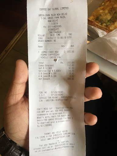 Read moreThe location of Cafe Coffee day is perfect, in the main road of green park Market. It has two floors. The sitting arrangements on both the floors quite comfortable. At the upper floor, there is an open area as well, where one can sit, watch the green park market. For those who want to smoke, they can use this open area. For all the orders you have to make the payment at the ground floor. They accept both cash and card. The menu is not very extensive. However the place is peaceful and the coffee served is perfect. I would recommend this place if you want to relax and have good conversation with...