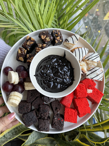 We Tried their assorted chocolate fondue which comes with banana red velvet brownie and donut spreaded over a plate.