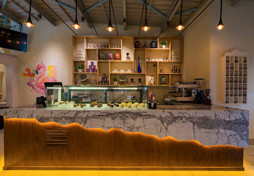 The cafe's design tells a more ornate story with three-arched walls hued in pastel pinks and blues, featuring homegrown artwork and enveloping the space in an expressionist vibe full of energy and passion.