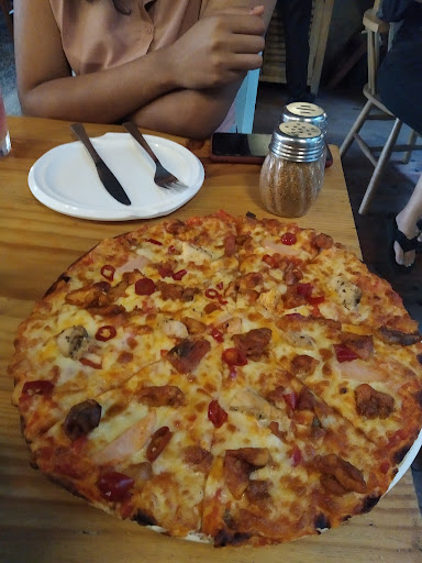 This cafe is located in Hudson Lane amongst a sea of other cafes. Easy to spot since it's set up in a two-storied building with classy exteriors as well as interiors. We went here on a Saturday. It was bustling with mostly college kids and/or families, and had to wait 15 mins to get a seat. The interiors were really pretty and instaworthy. There were paintings on the wall, and art sculptures hanging from the ceiling which gave it a sort of a boho look. We ordered the ultimate chicken pizza which came loaded with grilled chicken, sausages and Jamaican chicken. We were very excited to try the pizza however, the taste was so disappointing! It had a sour taste to it the kind which you can taste when something has gone stale or is on the verge of spoiling. (And yeah, I got a bad stomach ache that day after consuming it, which lasted till the following day) We also had tandoori prawns. Those were nicely cooked, thankfully. Tasted fresh, crunchy and had tandoori masala coated evenly. I really enjoyed finishing it. For drinks, we tried the butterfly pea flower lemonade. As the name suggests, we expected a blue hued drink from the butterfly pea flower extracts, but upon receiving it we were quite surprised to find a normal white lemonade with the butterfly pea flower placed on the glass mouth just for aesthethics. The lemondade tasted refreshing since it was a hot day, but I'm sorry to say, the name did no justice to the drink. Overall, service was remarkable. ✅ Polite servers and ushers. Waiting time was also low. I think we got our food just after 5 minutes post order. Ambience. ✅