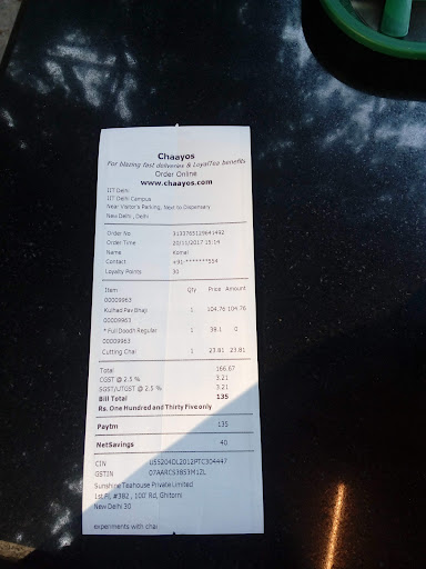 Chaayos present in IIT Delhi has a lived up to its reputation of Chaayos family. Both vegetarian and non-vegetarian foods are available. One of the best things about the place is the price of food items. Believe it or not, as compared to other locations, you can get nearly 60% cheaper food here because of the discount provided for IIT students. The home made style aalo-sandwich costs about 160 ₹ anywhere else, while it is just 68 ₹ in here. The raw materials for making dishes are pretty fresh and of reasonable standards. Also as the name suggests, it has its speciality "chai" i.e. tea. The variety and the taste are both upto the mark. If you are staying away from your home, you can get the taste of home made tea from here. Even there are various indian varieties of tea, like Gur tea, masala chai, elaichi chai, kutting chai, etc. You can eat at the place or take away, since both the options are present, which comes in handy many times. The system of generating OTP through phone for orders is an effective way of keeping in record their regular customers, which are benefitted with discounts and offers from time to time, like ₹100 cashback was available last month (December). On the occasion of 26 Jan, an awesome offer is also present, in which if you have a meal of 260 and above, you get a packet of namkeen free from there. Also on a purchase of 150, a chai is free worth ₹46. So for a chai lover, it is a place must to visit and explore the wonderful taste of dishes...