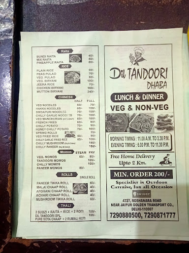 Read moreThis outlet located in roshanara road near ghanta ghar serves amazing north indian food which can make your taste buds go wow. I ordered dil tandoori special crispy chaap , dal Makhni , paneer tikka , aloo naan and paneer naan. Everything was quite amazing especially paneer tikka and aloo naan are must try items from here. Packaging was good too and quantity was also enough. All in all a great place to satisfy your taste buds and hunger pangs. Would love to order from here again. A highly recommend place to...