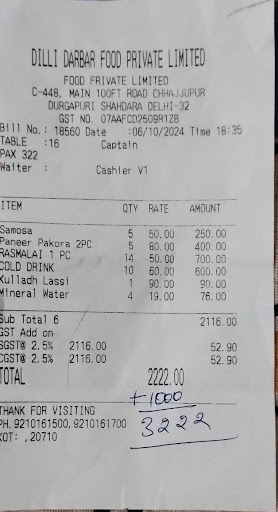 Read moreI recently had the pleasure of dining at Dilli Darbar Food, and overall, it was a fantastic experience. The restaurant excels in several areas, including its delectable food, top-notch service, and delightful atmosphere. However, I must address a minor issue with the parking situation, which slightly impacted my visit. Now, onto the issue of parking. While I thoroughly enjoyed my time at Dilli Darbar Food, finding suitable parking nearby was a bit of a challenge. The restaurant is located in a bustling area, and the limited parking spaces available can be a cause for concern. I recommend arriving early or exploring nearby parking alternatives to avoid inconvenience. However, I believe that the outstanding qualities of this establishment overshadow this...