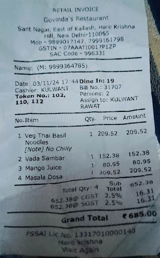 I usually visit the ISKCON temple with my wife and children, but on November 3, 2024, we went there to see the deity and afterwards, we thought of trying out Govinda's Restaurant as it was our first time. We sat at table number 19 and started off badly. The waiter did not come to take our order despite us calling him multiple times. We had to call him four times before he finally showed up. We ordered a veg chowmein without cabbage, but when he brought it, it had cabbage in it. When I asked him why he ignored our request, he just told me that it's not cabbage, but a Chinese vegetable.