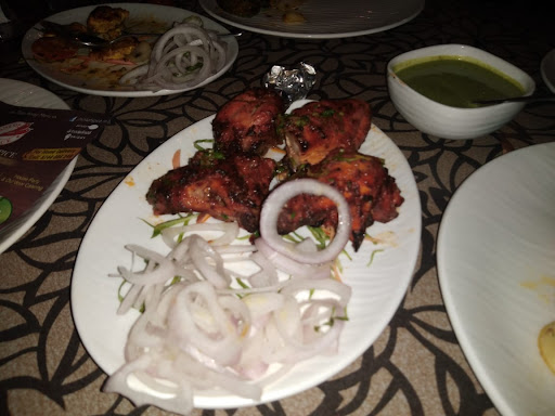 North Indian, Mughlai and Chinese food in a gold-coloured dining room with a TV on the wall.