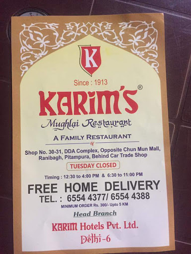 This restaurant is just what a mughlai food lover would love. Every dish has an unique name with great taste in every dish. It's not crowded like original karims, chandni chowk but quite hygienic and clean place. Located just near M2K pitampura and opposite to chunmun showroom. Parking available near shop for free & paid parking for ₹30. Outside sitting is available . Inside is place for 3 tables sitting of 4 people. Food is costly and quantity is less. But the class and originality of food will make you come here again and again. Best to try for beginners is shashan-e-murgh(jahangiri gravy) with naan(₹40)mildly sweet . Don't forget to have staters as mutton kebabs and mutton/Chicken burra. Cost for 2 people is ₹ 900. Costly, hygienic, eccentric quality and great craving for gravy. Full plate chicken item gets 2 people full die to limited quantity. It's a must must visit place for meat lovers living near rohini ,pitampura...