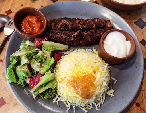 The cold mezze is served with fresh, warm pita. The muhammara, a dip made with walnuts and an assortment of spices, is a must have. The kebabs were juicy and tender, and the lamb tagine (with its secret mix of seven spices) is an adventure for your palate.