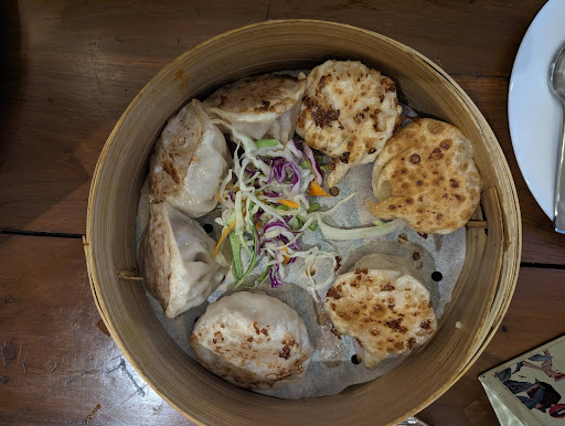 This place used to be a plush restaurant with the same cuisine. They don't have the name chefs, portion size, ambience, alcohol license or service anymore. They've just retained the location, menu and prices. The food isn't bad, but definitely not worth the price if you're paying an undiscounted bill. The 35% discount we got through an app made it just about worth it. They used to have a small balcony with a sliding door to allow for smokers to get their fix. That sliding door has been removed so they treat the entire dining area as a smoking zone now. Given the local cafe type ambience, that would probably work... if the prices were a little more reasonable. They've put a few large air coolers around which take up lots of the space, but they do still run the air conditioning units - which might be a bit more effective and efficient if they still had a balcony door to close. We may have confused them a bit with asking about the difference between the two types of momos and they got us the wrong ones. There were 3 adults and one 2 year old eating. We ordered 1 plate of mutton momos with jhol, 1 shapta, 1 Phokso, 1 Chicken datchi and 2 extra tingmos (one comes with the datchi). 3 lime sodas 1 watermelon juice 10 minutes later we were told that shapta wasn't available so we ordered 1 dry thukpa. When this was over, we still needed more, so ordered another datchi - and we don't really have very large appetites (especially the 2 year old). The drinks were in large glasses, but the food portion sizes are...