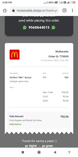 Read moreThe only good thing corona has brought to this outlet is online payments, now you can scan the QR code available it will redirect you to the mc donalds web page where you can place your order and proceed for payment through Google pay, Phonepe and Paytm upi methods. Earlier it used to be only card and cash which was frustrating because adjacent to it Burger king was readily accepting online payments.
