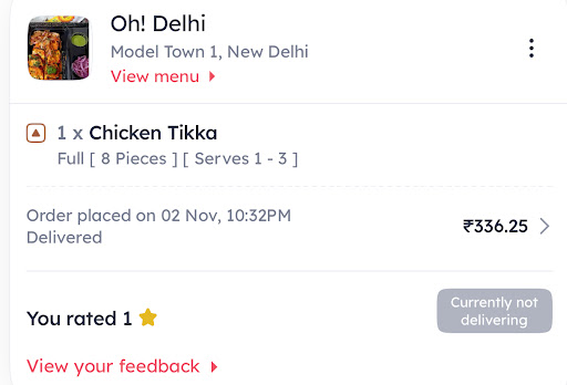 Read moreI placed an order on Saturday night from Oh Delhi restaurant, where I’m a regular customer. I’ve always loved their chicken tikka, momos, and tandoori chicken—they’re usually so tasty. But this time, when I tried the chicken tikka, it was so bad I almost felt like vomiting. It was extremely smelly, and even now, just thinking about it makes me feel nauseous. I tried my best to complain on Zomato, but couldn’t get through. If you want to keep your health safe, I’d seriously recommend avoiding this place. I ended up with food poisoning...