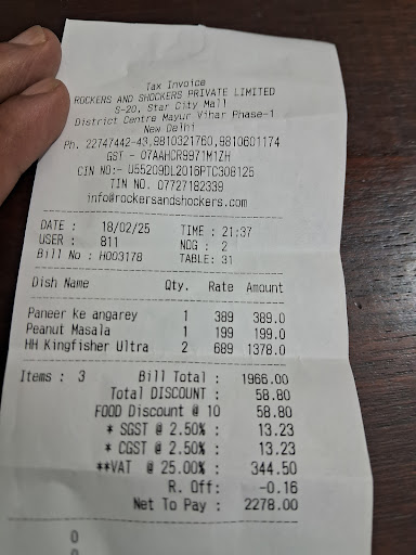 Read moreVisited Rockers & Shockers for a team lunch but to be honest not impressed at all! Ambience was nice but food quality was average with very limited options to try. We found the staff to be un-motivated to provide any type of quality service. They were not friendly and condescending. We were offered regular corporate discount but they levied additional service charge on final bill. I resisted as it is the customer’s choice to pay service charge at own consent but they forced us to pay. The Restaurant Manager Mr. Negi was so unprofessional & should be taught basic etiquettes to deal with customers. I wander why this restaurant receives less footfall even after locating in the prime location of Star City Mall. There are better options to try in the same or the very next mall. Will not recommend...