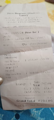 Read moreI have been to several outlets of Xero Degrees in Delhi and other cities like jaipur and Mussoorie. My experience was good so far. I recently visited this particular cafe with my husband in Hudson lane few days back and I was horrified by the pathetic food and service we received. We ordered veggie affair pizza, chicken strips and watermelon mint cooler. First of all, the veg and non-veg dishes were served after after a long interval to the effect that one person was eating and the other was waiting for rest of the order. This despite mentioning to bring the entire order in one go. Pizza, when it was finally delivered, came all dry and weird tasting. They do not make their own base. They use the store bought pizza base which was hard and chewy. I marvelled at the audacity that they served this nonsense with some veggies scattered and a little bit of cheese after almost 40 mins. I did complain about the weird taste but the manager didn't bother. 'Madam Aisa hi hai, store se purchase Kiya base use karte hai' - the exact words of the person concerned. P.S. My gut feeling about the weird taste was not wrong. I am writing this reviews after 5 days because both of us suffered severe food poisoning after returning home. It started with a mild stomach ache and ended with a trip to the hospital in the middle of the night.