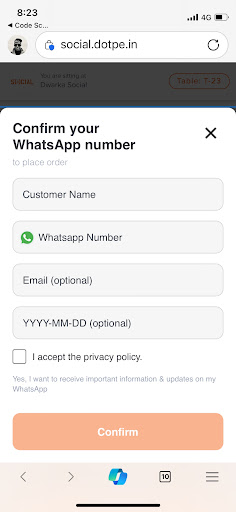 I gave my number unwillingly and was seated at a high table and pointed to a qr code to order. An army of servers spread across the place and on scanning the QR code I was shown the attached page. Where I HAVE TO MANDATORILY select the option to give away my privacy to place an order of keema bao and peanut butter shake.