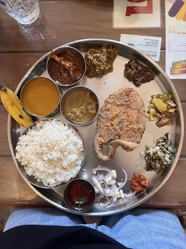 While there are North Indian and Indo-chinese dishes on the menu, this place specializes in food from the Konkan region and Goan seafood in particular, and that's primarily why you should be heading here (Why would you make the trek to this nook on a Goan island connected only by ferry for anything else?). If it is your first time here and you're not sure what to try, opt for the fish thali (₹150, as of Nov 2021) that can be upgraded to special fish thali (₹250, Nov 2021). The seafood is locally sourced and fresh. Availability of a particular fish depends on the catch for the day, so check for your options. Squid prepared in the local style in spicy red masala, and the rava batter fish (I tried Chonak) fry were 👌.