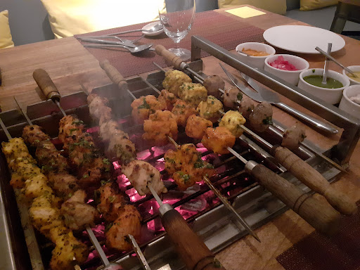 Once seated you'd be served starters, a little chaat treat - enjoy the mix of flavours! After which a live barbecue grill will be placed in front of you, burning hot... A variety of options to choose from, fish, chicken, prawns and vegetables all hot and fresh, ready to eat right off the grill!