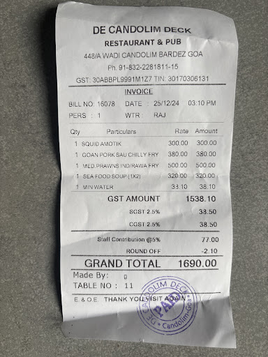The service at De Candolim Deck was decent. The staff was attentive and friendly, ensuring that we had everything we needed throughout our meal. They were prompt in taking our orders and delivering the food to our table.
