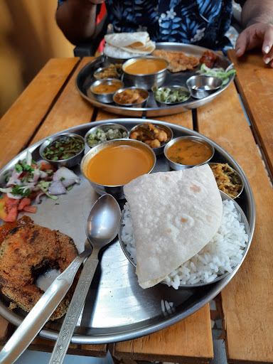 The thali contains following items- ✔ Steamed Rice ✔ Fish Curry (Same for both variants) ✔ Sukhi Bhaji ✔ Chana Masala ✔ Galmyache Sukhe ✔ Dal ✔Chapati ✔ Fried Fish ✔ Salad ✔ Mango Pickle ✔ Sol kadhi