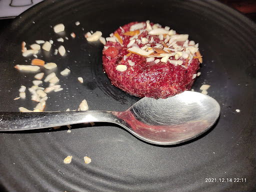 Taylor's Version: Yeah so I went there with a couple of friends from college, all of us had received glowing recommendations from Instagram as well as from acquaintances. Like what they have done with the place, it's got a nice "vibe" as the kids say. The Kebab festival "unlimited" buffet package consisted of 1 drink, 1Chicken Biryani, 1 Dessert and Unlimited servings of Kebabs on order till the end of offer timings which was 11:00 PM. The Kebab platter had only vegetarian and chicken dishes. No mutton The Biryani was a let down, however the only one. It was seemingly doused in Rosewater which we were told is how "Awadhi" Chicken Biryani is supposed to be, when we raised our contempt. Dessert was beetroot halwa which was amazeballs So coming to the main attractions, the selection of Kebabs. They were all amazing and I would highly recommended going to the Kebab festival while it's on. Having said that I wouldn't see a reason to go to this place after the festival period. Yeah so I'll rate the individual items in the platter relative to themselves. Oh yeah didn't like the seekh kebab unfortunately, was a skip Hara bhara 5/5 Soya chops kebab thingy 5/5 Roasted cauliflower thingy 5/5 Seekh Kebab 2/5 Malai Kebad 4/5 Chicken Tikka kebab? 4/5 Chicken Galoti Kebab 5/5 There were more items too that I can't recall rn, I think The veg items on offer tasting as good as the chicken items was a pleasant surprise You could repeat the whole platter or just one type of Kebab as many times as you would like the only caveat was that everything was made on order so there was the time delay between each round. Also they asked us to write a review atleast 4 times. Service was nice too I have only this one badly clicked photo of the Beetroot halwa cuz my friend hasn't sent me the kebab pics yet but yeah...