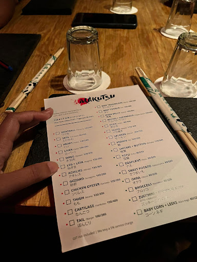 1.The order placing process is extremely confusing. We were a table of 10 and were given two sheets of paper with about 30% of the menu crossed out as unavailable. 10 of us had share two papers (they could have given us 10 papers) so we had to get one of us to record everything which is such a waste of time. We all had to count how many and what type of Yakitori each person wants and then one of us has to make notes. The food took quite a long time to arrive We were given a broken chair to sit on. I'll forgive that as we were a table of 9 but ended up being a table of 10 and the last chair given to us had a leg broken, so perhaps they weren't prepared for an additional person. All the Yakitori was bland. Non veg Yakitori was underwhelming. The veg Yakitori we ordered such as sweet potato and brinjal was mostly raw in the middle. Service was terrible. Halfway through our main course (when 2-3 people on the table didn’t even get their orders yet), they asked us to pay the bill because apparently when the clock strikes twelve, the day and the server changes on their system. It was 11:20 when they asked us to clear the bill.. not even close to midnight. But even if it was - how does the server matter when the restaurant is getting the money on, before or after 12? That apart, they told us the last order was at 10:30 which was fair. But usually dessert doesn’t count as a food order as it’s already prepared. When we asked to order dessert at 11:40, they said we couldn’t as the time to order was over. This is for cheesecake, and the staff was quite unapologetic. I’m pretty certain they don’t make cheesecake after the order has been placed, so serving ready cheesecake shouldn’t be an issue. We asked if we could split the bill and make multiple transactions (since we were a table of 10) and were told we couldn't. The staff just seem miserable working there and don’t want to make even a small effort to please a guest with such routine requests. The best items we had were all the raw items - Surf and Turf, Rare beef ponzu and Tuna Tataki. Anything cooked was terrible. No noodle items were available so our options for mains was simply Donburi and Chicken Katsu Curry. Quite sad. Seems like the place is riding on hype and the name of the chef-owner rather then on good food and service.