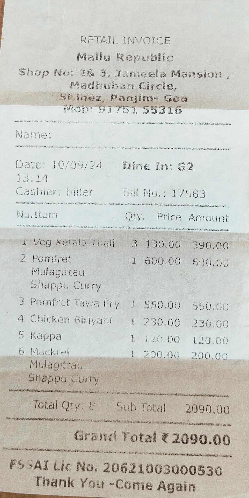 But the specials like fish curry, fish fry, etc., are very costly and spicy. Normal Kerala Fish curry is not available here. Fish curry and fish fry are called mulagitta shappu curry and thava fry respectively. So they price it in higher end. An average chicken biriyani is also costlier than other restaurants in goa.