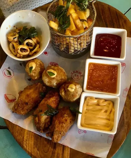 Nonveg Platters Consisting Of Peri Peri Fries, Chilly Garlic Calamari, Chicken Cheese Keema Balls, Chicken Wings..