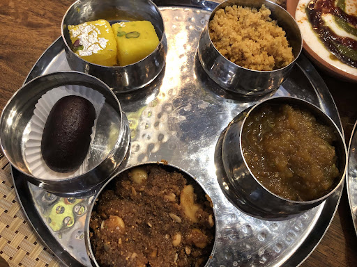 Maharaja Thali: This unlimited thali can be shared by 4 people. First they served us Khasta kachori Chaat, Papadi Chaat, Rajasthani Papad and Chaach. Khasta kachori Chaat: This is literally burst of flavours in your mouth. Best kachori chaat we have had till date!! Papdi Chaat: Another great Chaat variety. It was very crisp and flavours were on point. Rajasthani Papad: So flavoursome and crispy. Chaach: Perfect soothing cooler to sip on while you feast on the thali. Next we were served Punjabi platter. Punjabi platter: This whole platter including the dips and chutneys was just awesome. It consists of Aloo Tikka, Babycorn Tikka, Mirchi pakoda accompanied with Mustard dip, Green chutney, Lehsuni chutney, Pickle and Salad. Specially the babycorn Tikka marination was very unique. Next, we were served with Main course platter. Main course platter: This covers authentic Rajasthani and Punjabi delicacies. It consists of Dal fry, Gatte ki sabji, Kadhi, Dal makhni, Mangode ki sabji, Ker sangri, Papad pyaaz ki sabji, Steamed rice, Bhindi fry, Matar paneer, Punjabi chole, Shaahi paneer, Masala rice, Karela fry, 4 types of roti(butter roti, butter naan, baajre ki roti, jowar roti), Dahi bhalla, Churma and Boondi raita.
