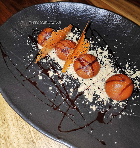 DESSERTS~ Gulab Jamun, caramelized white chocolate, khoya crumble - Outstanding mix of ingredients. Soft gulab jamun with a base of khoya and white chocolate with chocolate sauce drizzle tasted amazing. This dessert was a perfect end to a perfect meal.