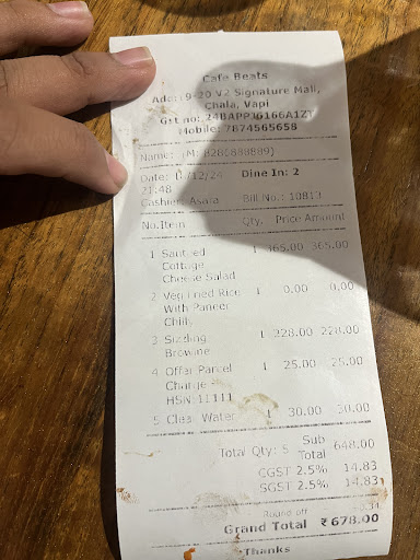 I was planning to celebrate my son's birthday so I called up the Manager, Asara Khan a day prior to set up the decorations and enquire about discounts as I had redeem points, she confirmed with us that we just need to visit the café and we could use our redeem points. On the day we visited the café, we asked for the discount during the payment, the staff had made a mistake regarding the name on the bill, I called up the manager for the same, she started being rude to me and said it's our fault. She added 'It's my café, do not visit again' , her words exactly. Even though the staff and food were fine, the manager Asara Khan was quite rude, said that she is the owner of the Café Beats, and ruined our event. Worst experience, I would not recommend such cafés where customers are...