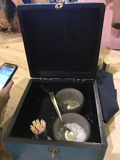 The whole idea of this restaurant is to challenge the conventional paradigm. From choosing an oval shaped enclosure rather than square to giving wet wipes instead of finger bowl and a big ornate box that has your mukuwas and bill at the end. This this place a really unique experience in city. I can easily compare it to other great restaurants like Nini’s Kitchen and Poetry cafe in Ahmedabad.