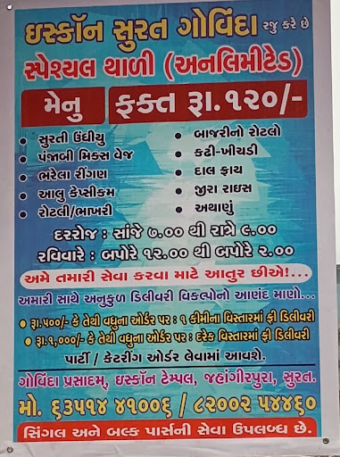 Read moreLocated inside ISKCON Temple, Jahangirpura, Govinda’s Prasadam is a hidden gem for those seeking No Onion, No Garlic pure vegetarian food in Surat. Their Special Unlimited Thali (₹120) is wholesome, sattvic, and filled with Surti flavors like Undhiyu, Bajri Rotla, Bharela Ringan, and more.