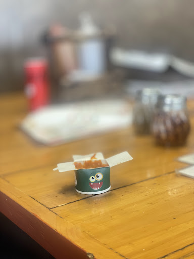 The decor is fun and eclectic, with vintage signs and colorful artwork adorning the walls.
