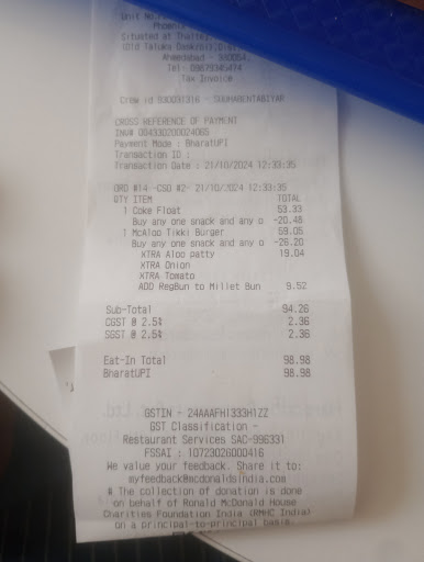 Read moreThe McDonald's at Palladium Mall in Ahmedabad is a great place for a quick and tasty meal. Here’s a simple review: