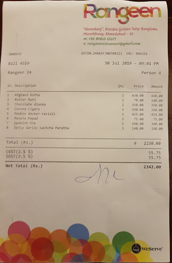 Read moreHad heard about this fine dining place Rangeen from localites and I had to visit here before I left for home. Professionalism from start, the moment I called for reservation a message with code on my phone. Rangeen is located in Ambavadi area, has a designated area for parking as well which is rare to see in this area. Rangeen and 650 The Global Kitchen share the same premise. 650 is on level 0 where as Rangeen is on level 1.