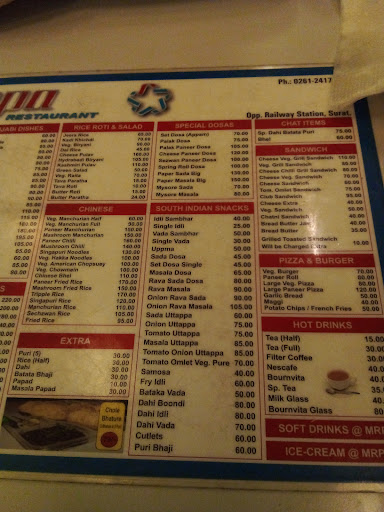 Read moreThis place is in front of the Surat railway station is at little right side the auto rickshaw stand which is attached to the Surat railway station it is exactly in front of that opposite on the road The menu is very large they have many varieties of food as you can see in the menu all of vegetarian thalisa available and fast food as well South Indian North Indian Punjabi I tried their mysore masala dosa and schezwan paneer dosa in which there was no paneer just they have created the paneer and given the mysore masala dosa was so sweet I did not like the taste The service is very good here But you cannot sit there because as soon as your order is finished they keep on running on The bill the payment please get up the customer has arrived All to the services very good the uncle who serves the food and take the order is very kind a very generous I like his behaviour very much But for food purpose I won't be...