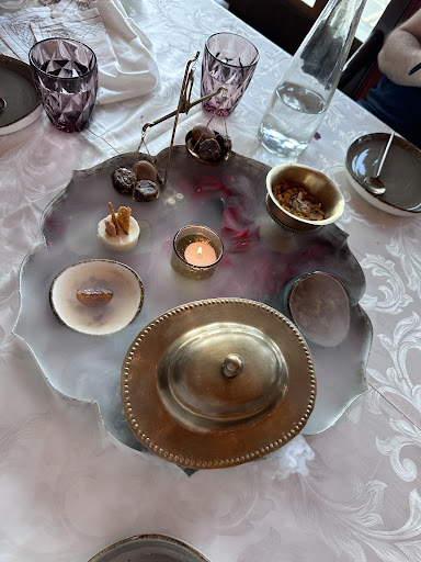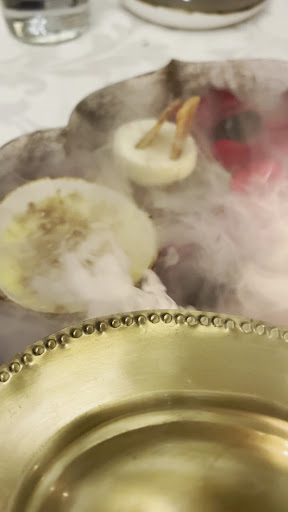 ▪️To end the long-lasting menu we had a 𝗠𝗶𝘀𝗵𝘁𝗮𝗻 𝗣𝗹𝗮𝘁𝘁𝗲𝗿 ( a platter of sweet indulgence) which includes one milk halwa, chickpea burfi called as Magaz, ice cream kulfi, Ghevar Tart and Mohanthal. The thal was decorated with rose petals and a smoky effect was given to the kulfis.