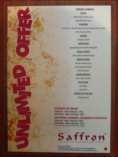 Read moreIn this expeditious world it is undoubtely true that world is now changing so the food but description of this restaurant and it's food is good and moreover ambience of the restaurant is best. It is believed by group of people that saffron restaurant has developed more and has various franchises and among all those branches I'd go to C.G. Road branch with our family and opted for an unlimited dinner that night I tasted manchow soup as a first dish in our menu and it was absolutely fabulous. Beyond doubt there are several compelling reasons why some people believe that sizzler that we had is not good choice I personally didn't liked. Secondly as per the trend of growth in FMCG market you need to add great taste to surrvive in this industry but also you shouldn't compromise to quality with great quality and great customer service things will get more easier. Interestingly there is another perspective to prevail upon is that downside of this restaurant I personally didn't like the sizzler so my recommendation is that you improve taste of item. To conclude I summarize if you're on low budget and then you can go to this restaurant or if you want to try food items from this restaurant you can go for once in...