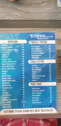 Ā Ā Ā Read moreIts an outlet of krishna restaurant serving great indian hot snacks like fafda , samosa ,bhajiya ,kopra kachori,sev usal ,dahi wada ,all above items with usals also , ,bataka pauha ,vada pao ,chole bhature ,chatako a sizzling hot item and patras and many more with chatnis and in dessert hot jalebis also available ,handicap seating and parking also available parking can be an issue when many customers are there,rest room and wash area also available its a non ac outlet best time is monsoon and winter ,table service offered ,no advance bookings ,usually its full during rush hours ,many options ,its a pure vegetarian outlet and tasty food worth a try with friends ,best thing is fast service cofee is good ,tea its watery not...