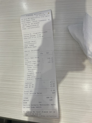 Overall, the Subway South Bopal branch provided a great dining experience with its excellent service and high-quality ingredients. I'll definitely be returning...
