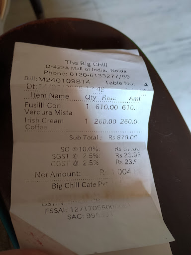I recently dined at The Big Chill (Mall of India, Noida) and was thoroughly disappointed with the food. Given the high prices, I expected much better quality, but unfortunately, it did not meet expectations.
