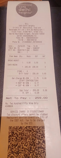 Read moreI visited Cafe Delhi Heights in Ardee Shopping mall in Gurgaon. I was pleasantly impressed by the warm and welcoming English pub style decor. The first impression was that of entering a lounge cafe with wooden chairs and tables on one side and small lounges separated by curtains on the other. Their menu is interesting and includes a wide selection of continental dishes. However, I only ordered a caffe mocha which was pleasantly accompanied by a basket of bread (free) and three biscuits included in the price. Two jeera cookies and a small meringue. Served in a small glass jar instead of the usual plate. The mocha coffee was great and at my request they added more coffee and less chocolate. For a coffee lover like me, it was a pleasant regenerating break. Well done and I will...