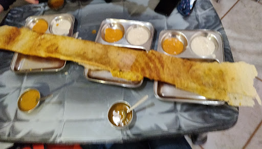 They offer different varieties of south indian delicacies like dosa, vada, idli, uthapam, rasam rice, sambar rice etc.. In dosa itself there are different varieties and I have tried most of them. I would recommend coconut rava masala dosa and the madurai special dosa as they are my favorites and they are delicious. Dosa is served with coconut chutney, sambar and one more chutney (i think tomato but not sure)they also taste awesome. As soon as you have a seat they will serve you with sambar, we generally finish the saambar even before they serve dosa and they will happily serve extra sambar when they bring the order to the table. One can ask for extra chutney and sambar and they'll never refuse or charge extra. I have also tried their vada and idli and both were soft and tasty. I once tried their uthapam but i didn't liked it. Also I once went with 3 of my friends and we ordered their 2 ft long dosa (i don't remember the name) and it was also delicious and enough for 4 of us (see pic). I think it costed us INR400. Their dosas start from INR 80 to 170 and the prices might be a liiiiitle high as compared to other such local food joints but its worth the taste. They have 4 tables inside and i think 4 to 5 outside with seating capacity of 4...