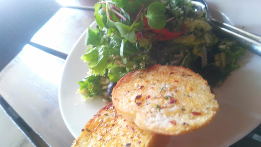 The Veg Pesto Pasta Salad was a surprisingly zingy and tasteful. It had , bell peppers, lettuce zucchini, cherry tomatoes, Olives and fusilli pasta dressed up with Pesto dressing and topped with grated parmesan. The garlic bread they served alongside worked as a perfect accompaniment.