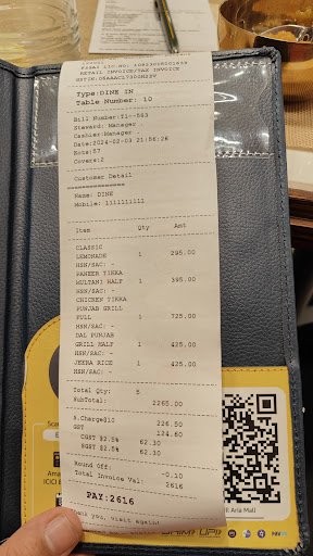 Read moreI recently visited Punjab Grill at Airia Mall (2nd floor) during the evening. Though I was already full from snacks at Cinepolis, I ordered a Mango Lassi, which was excellent in both quantity and quality. I also tried the Vegetarian Tandoori Platter, but found the quality lacking. Later, I realized I could have customized the kebabs, but as a first-timer, I wanted to explore. The Paapdi Chaat was decent, though nothing extraordinary since itâs more of a street food dish. The ambience, however, was truly royalâclean, well-lit, and hygienic, though the prices were on the higher side. The prices were quite steep, they served me a 750ml AVVA mineral water bottle that costed âš200, not sure I could have asked for some other bottled water.