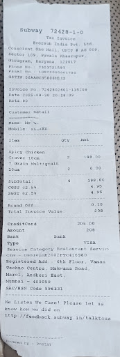 Read moreStaff particularly Mohit is pathetic. I ordered a chicken teriyaki footlong. Bread was completely burnt. After calling them a lady picked the phone and accepted they send a burnt sandwich. She then gave phone to Mohit. Mohit instead of accepting told me nothing can be done about it. I asked for customer care and told him i would be writing a complaint. He then disconnected the call. Subway, you have a pathetic guy named Mohit who is ruining your brand. Never...