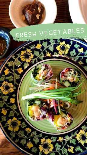Fresh Vegetables Summer Rolls which is rice paper rolls filled with seasonal market vegetables, vermicelli noodles, Vietnamese herbs served with peanut sauce — truly meriting the adjective "fresh".