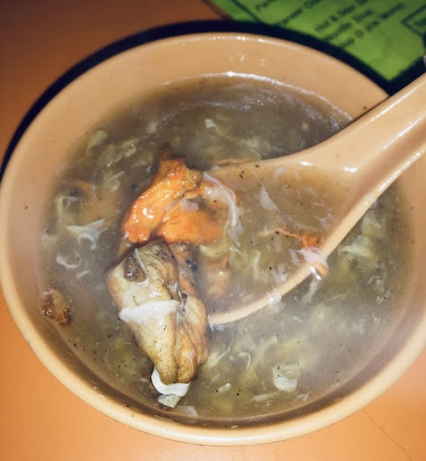 Chicken soup had tiny pieces of chicken in sufficient quantity. It was hot and spicy.