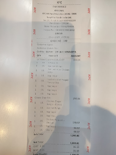I visited the store on 2 Mar 2024 along with my family and the store's disgusting/ pathetic service completely ruined my lunch time. The regular chicken ordered was burnt and was too oily (our tongue could really feel an artificial layer of the oil) because at the same time there were few customers waiting as well. In a hurry it was obvious that some of the orders were not up to the standard of KFC. In comparison the Chandigarh store sector 8 is the place which really maintains the KFC standard but this particular store at sector 20 Panchkula literally fails to do it. It has happened many times now and finally I decided to write a review.