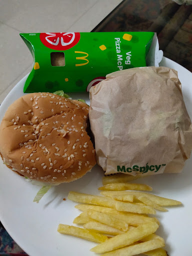 McVeggie Burger : Nice crispy burger. The patty is made of mixed veggies. The melted cheese enhances the flavour of the burger. Its not spicy & hence would suit any taste bud. Buns used are also soft. Good one indeed.