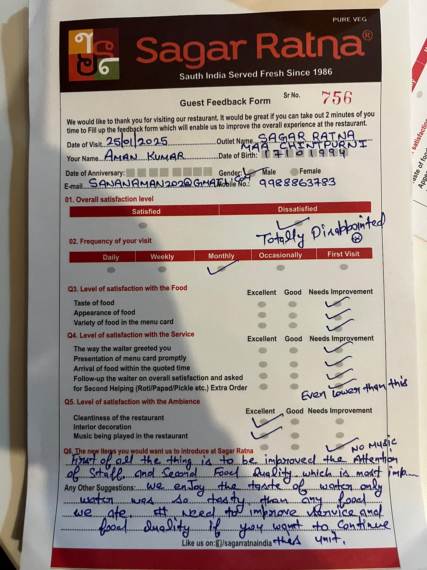This wasn’t just mismanagement — it felt like outright neglect. Favoritism, indifference, and complete disregard for customer experience. Sagar Ratna really needs to take a hard look at their service standards. I walked out extremely disappointed and won’t...